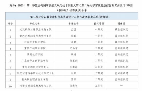 (通讯员:兰晶)金砖国家技能发展与技术创新大赛(以下简称“金砖大赛”)是2017 年金砖国家最高领导人会晤筹备委员会认可、经中华人民共和国外交部备案、金砖国家工商理事会批准,由金砖国家工商理事会中方理事会、“一带一路”暨金砖技能国家技能发展国际联盟、中国科协“一带一路”暨金砖国家技能发展与技术创新培训中心主办,中国发明协会教育部中外人文交流中心联合主办的国际大赛。在获得该大赛虚拟仿真技术产品开发与创新赛项(教师组)一等奖后,我院教师兰晶再次参加元宇宙教育虚拟仿真资源设计与制作赛项(教师组)。