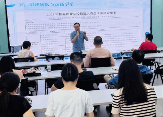会议伊始,由张婷老师和周佳麟老师分别根据自己2025年世赛执裁经历,深度解读赛事规则变化。新赛制强调参赛选手“既会做,也会说”,学生须具备扎实的理论基础和熟练的操作能力,尤其要注重表达与沟通,能够清晰地向裁判阐释操作依据。世赛评分标准向实操规范性、细节把控能力倾斜,参赛选手需注重工具使用顺序、数据记录格式等‘隐形加分项’。两位裁判强调:大赛不仅是技术的较量,更是心态和体能的考验。因此,备赛要营造高压力、高仿真的竞赛环境,帮助学生提升抗干扰能力和突发应对能力。