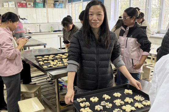 随后,居民们按分组动手实践。有的揉面、有的擀皮、有的包馅,大家分工协作、互相帮忙。年长的居民手法娴熟,主动分享生活中的烘焙经验;年轻居民则发挥创意,将酥饼捏成花朵等可爱造型。实验室里,面粉翻飞间满是欢声笑语,浓郁的黄油香气渐渐弥漫开来。待金黄酥脆的酥饼新鲜出炉,居民们捧着自己亲手制作的成果,脸上满是成就感。