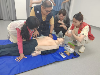 在实操练习环节中,参训学员4人一组,利用人体模型进行现场心肺复苏及海姆立克急救法操作演练,大家认真听讲、积极互动、反复练习,努力把每一个急救动作做标准、做到位,现场学习氛围异常热烈。通过系统的急救培训,参训教师都能够掌握基础的急救知识和基本的操作要领,在互动交流环节中,大家积极分享自己此次活动的收获和体验,并就实训教学中遇到的一些疑问进行了现场交流。