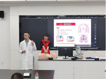 在培训会上,生命健康学院孟明翔老师通过理论讲解、现场演示等方式进行授课,列举近年来发生在身边的鲜活事例,通过图片、文字、视频,引入CPR“心肺复苏”和“海姆立克急救法”的普及宣讲,运用现场操作的方式,对急救知识进行生动、形象地介绍,并以模拟橡胶人为器具,志愿者现场示范,演示了心肺复苏和海姆立克急救法的动作要领。