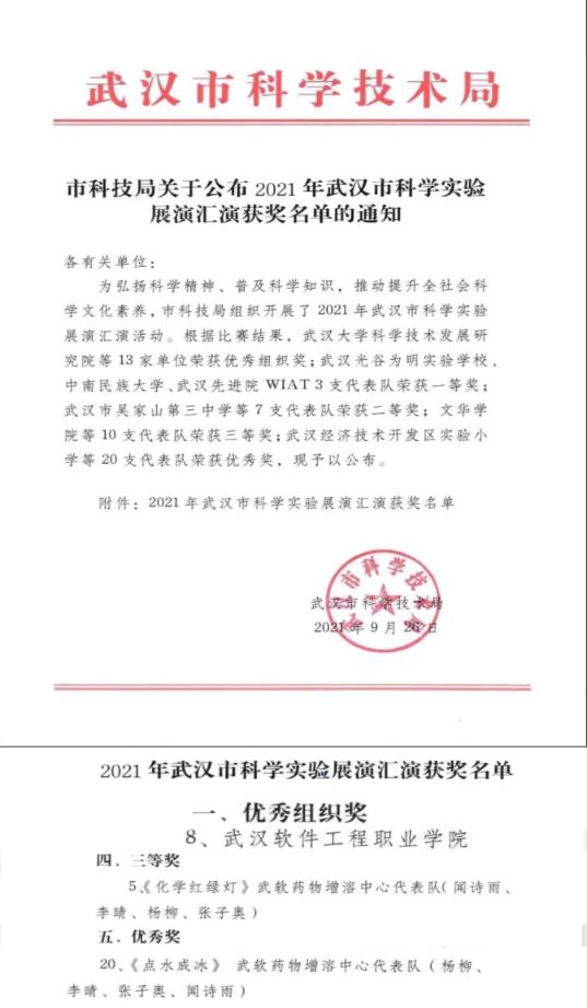 (通讯员余磊)环化学院科研平台——武汉市科技局药物增溶工程技术中心承担了学院专创融合试点班的人才培养工作。在该科研平台上,同学们跟随老师一起开展科技创新研究、运作创新创业项目。除了双创的工作,同学们还积极参加科普宣传赛事。在2021年7月武汉市科技局举办的武汉市科普讲解大赛中,张子奥同学与本科院校教师、科技馆讲解员等实力强劲的对手同台竞技,荣获优秀奖。2021年9月武汉市科技局举办的武汉市科学实验展演汇演活动中,闻诗雨、李晴、杨柳同学两个作品《化学红绿灯》、《点水成冰》分别获得三等奖和优秀奖。同时我校被市科技局授予优秀组织奖。该四个奖项,实现了我校同学在科普工作成果中的零突破。