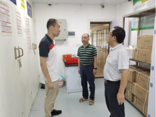 金学平院长一行首先直奔1号教学楼危化品仓库。闻到一股浓烈的中药材气味,金学平院长向实训室张毅主任询问其使用和管理情况,强调要做好防潮措施。走进危化品仓库(固态),吴雨龙副院长看到储物柜堆满了各类药剂,要求实训室加大统筹协调力度,将存放时间长的先使用减少存放空间。在危化品仓库(液体)门口,金学平院长详细询问了摄像头的使用状态,要求与保卫处加强协调沟通,保证暑期在监控之下。