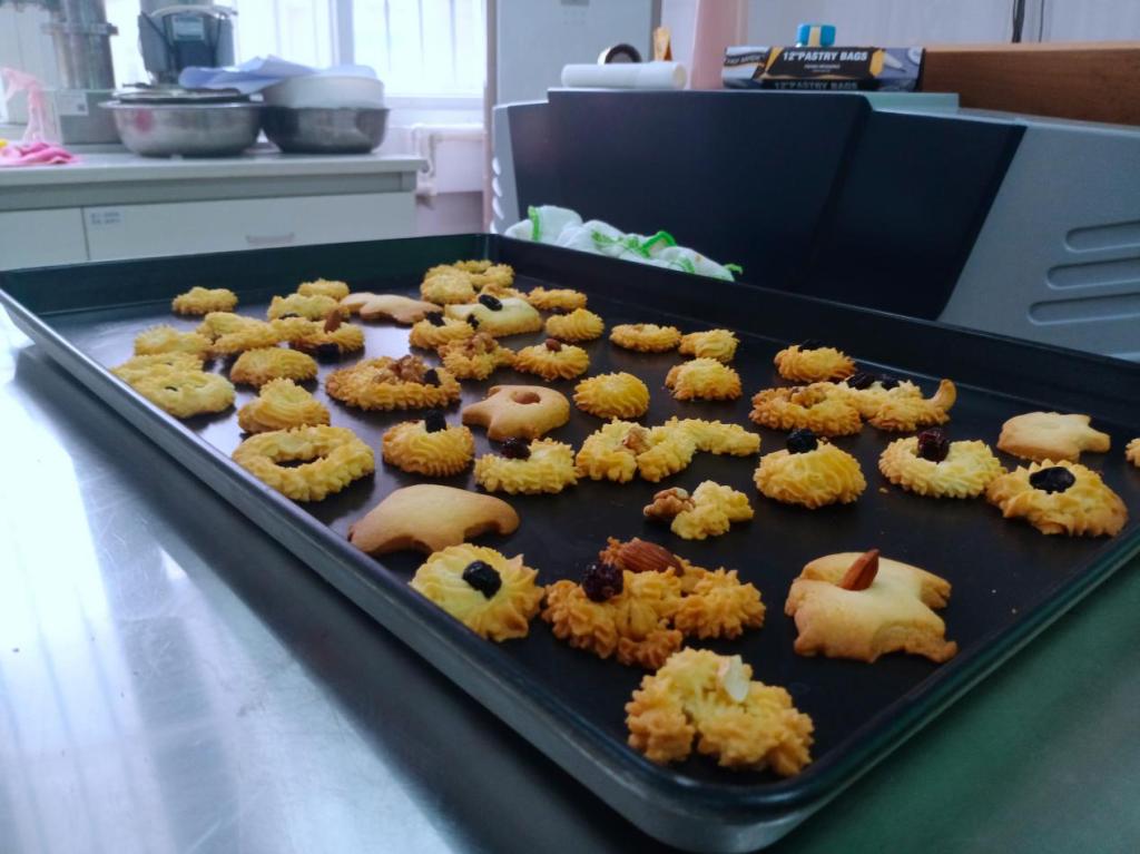 “哇,妈妈,这个好神奇呀!”小朋友们指着操作设备惊喜地说。“是的,宝贝,你快看,曲奇饼干是这样挤出来的!”家长耐心答到。先将白砂糖、鸡蛋、色拉油混合均匀,加黄油进行搅拌,再用面糊调制,挤成一个个好看的花朵、数字、字母等模型,用葡萄干、蔓越莓装饰打扮,最后进行烘烤。等待片刻,香喷喷的曲奇饼干和软绵绵的海绵蛋糕就制作出来啦!“制作过程虽然有点累,但是我们很开心。”大朋友和小朋友们表示,谢谢学校的“热情款待”,这次活动特别开心。