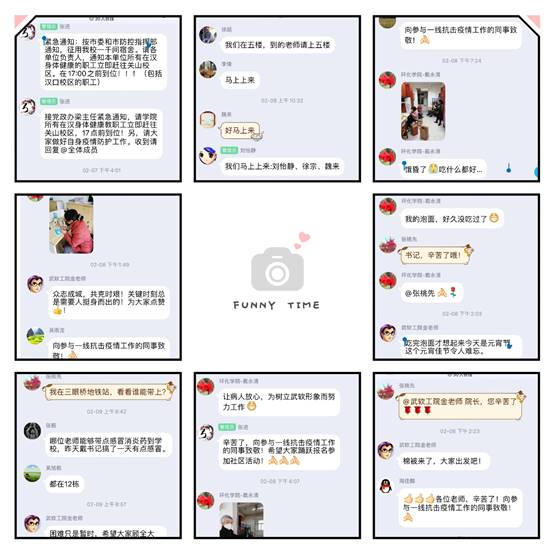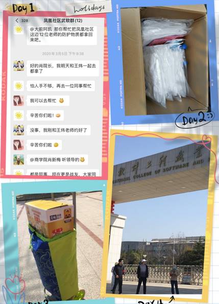 最后,特别感谢学校为我们准备的防护物资,你是我们坚强的后盾;感谢一起战斗的武软同事们,感谢肖新梅院长,和陈元凯、王炜、石金发老师,不辞辛劳往返学校把物资送到小区门口。虽然我们来自不同的学院,至今也没看到你们的容颜,但我能感受到你们的爱心和热忱。