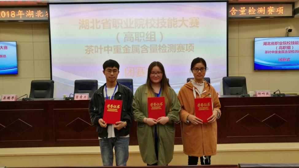 (通讯员:李莹)2018年10月12-14日,由湖北省教育厅主办,湖北省教育科学研究院承办,2018年湖北省职业院校技能大赛(高职组)"茶叶中重金属含量检测赛项"在湖北生物科技职业学院举行。环化学院4名选手在比赛过程中,坚持自信,沉着冷静,荣获了推荐组三等奖和抽测组二、三等奖。