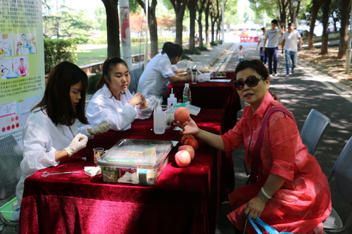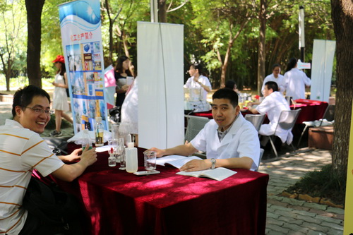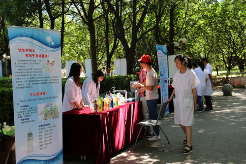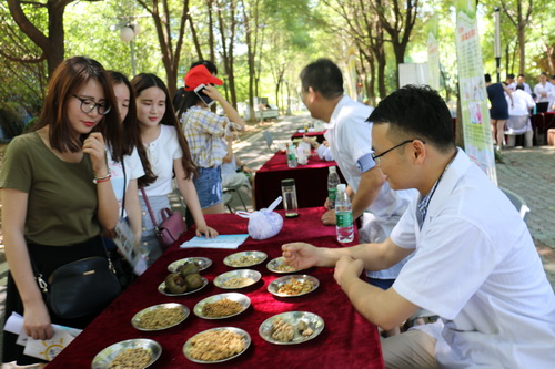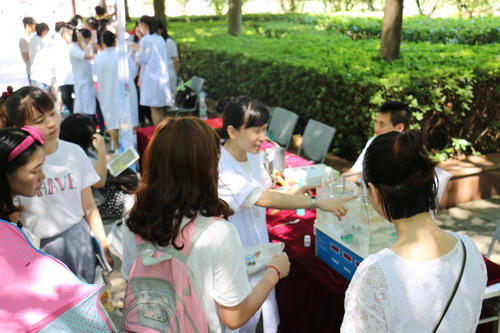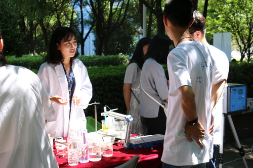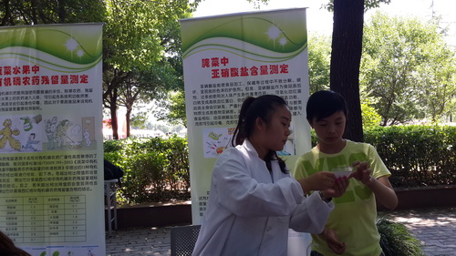 绿茵树下,络绎不绝的人群簇拥在项目展示台旁:空气中PM2.5、甲醛的测定;果蔬中有机磷农药残留量的快速检测、火腿肠中亚硝酸盐的测定;矿泉水、可乐、果汁饮料酸度的测定;药物崩解---药物在人体胃中崩解溶散过程演示;常见中药材辨认及药理功能介绍;一个个紧密结合绿色、环保、生命健康特色的项目吸引着参加活动的人们驻足,不时有学生、家长饶有兴趣咨询提问,并兴趣盎然地亲自参与项目实践,共同感受科技的魅力。