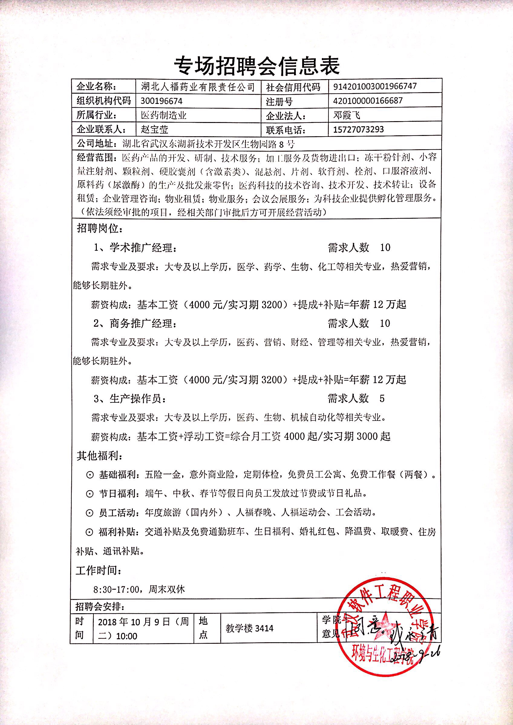 武汉人福药业有限责任公司武汉软件工程职业技术学院招聘简章