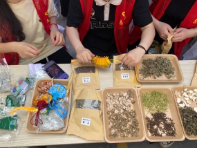 当天上午我院学生志愿者早早到达活动地点,开始布置场地,将香包、针线及各种药材整齐地摆放在桌上。活动开始,志愿者们首先向大家展示并讲解本次端午香包的药材,有清凉驱蚊的薄荷,有杀菌防虫的紫苏,有芳香开窍的石菖蒲......,大家认真听着志愿者们的讲解,不时看看药材的样子,闻闻药材的味道。