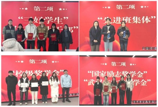 在热烈的掌声中,颁奖环节依次进行。学院领导及老师分别为获得“三好学生”、“先进班集体”、“武汉市政府奖学金”及“国家奖学金”等个人和集体代表颁发证书与奖牌。