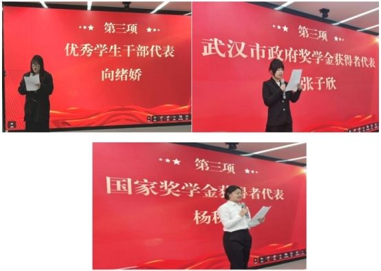在获奖代表发言环节,三位优秀学子依次登台分享成长感悟。优秀学生干部代表食检2302班向绪娇,讲述了服务同学、锤炼自我的心路历程;武汉市政府奖学金获得者药产2403班张子欣,对武汉市提供的支持与学校的悉心培养表达了诚挚的感恩;国家奖学金获得者化工2301班杨秋雯,则以扎实的学业成绩和竞赛实践,诠释了新时代青年的责任与担当。