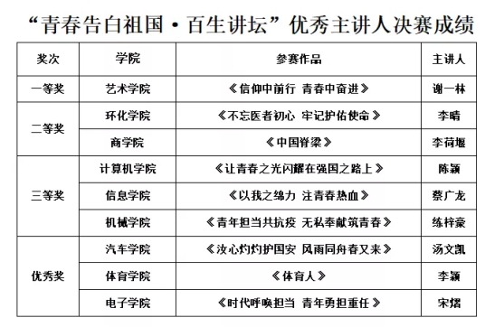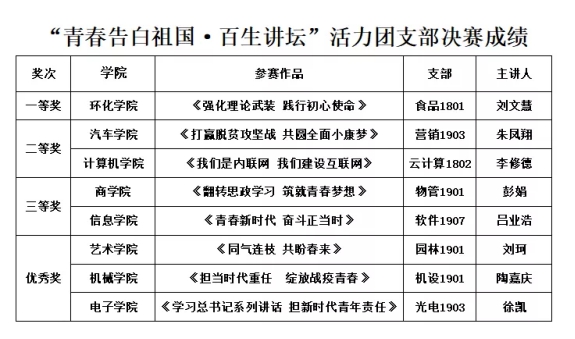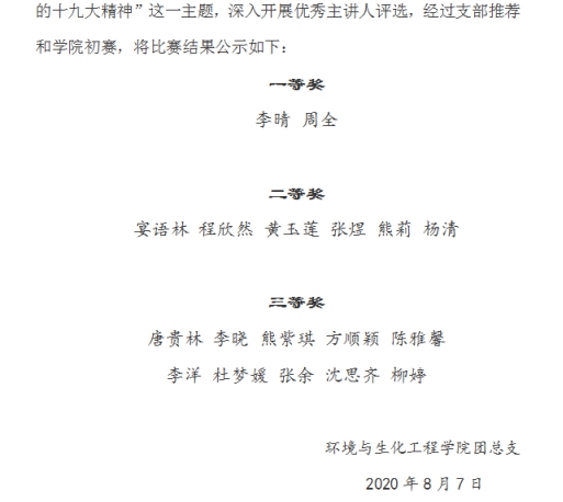 (通讯员:陈晶 摄影:陈晶)为进一步推进习近平新时代中国特色社会主义思想进支部,学习习近平总书记抗击新型冠状肺炎疫情、全面打赢脱贫攻坚战等相关重要讲话和指示精神,结合校团委有关要求,环化学院团总支紧紧围绕“学习宣传贯彻习近平新时代中国特色社会主义思想和党的十九大精神”这一主题,深入开展优秀主讲人、活力团支部评选,经过支部推荐、学院初赛和校级决赛,最终食品1801班团支部从8个参赛学院中脱颖而出获得一等奖,李晴同学获优秀主讲人二等奖。