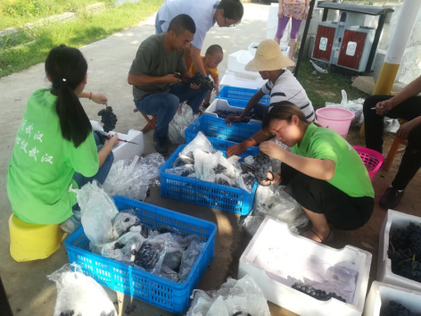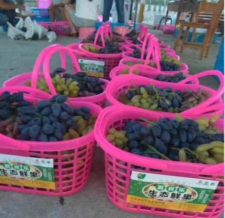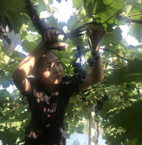 接下来的每一天都很充实。一进葡萄园区便看到一大片一大片绿油油的葡萄树贪婪的吸收着阳光,努力的储存着糖份,等待着主人的青睐。没有游客的时候我们就一边学着修剪着葡萄一边听果农跟我们介绍哪些是“夏黑”、“腾云”哪些是“红布拉多”它们都有什么区别等等。周末游客密集的到来,我们个个都成了销售能手,给他们介绍葡萄的种类和特色,引导他们采摘,需求量大的时候,我们还要要分头进行采摘、修剪、包装等等。汗珠从额头流进脖子,衣服也早已汗湿,园子里各种蚊虫不停的向我们发起进攻,腰酸背痛已经被我们忽略,终于筐子堆满了葡萄,我们完成了任务回到凉棚。看着仍然在地里劳作的果农们,这一刻是真正的了解到农民的不易,他们是怎么度过一个又一个的夏天在地里耕耘着。