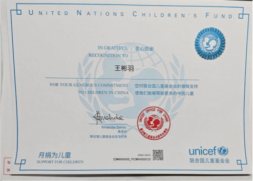 他是一位充满爱心和社会责任感的青年。在大一年级积极加入学生会,参加学校各类志愿活动,在校园的很多角落,都留下过王彬羽温暖的身影。在参加校外的志愿活动中,无论是关爱老人还是助力环保,他都全身心投入,用耐心和细心为他人带去帮助。他说“有一分热,发一分光,点点微光汇聚,便是璀璨星河。”他在联合国儿童基金会所开展的月捐为儿童公益活动中,每个月保持着对偏远山区儿童捐款。他说“我在农村出生,我知道偏远山区孩子的艰苦,虽然每次捐款的金额不多,但这是对他们的一种关爱,我想用这样的微小支持,守护他们纯真的笑脸。”他以爱心传递温暖,让青春在奉献中绽放绚丽光彩;他用行动转递正能量,彰显着新时代学子的温暖情怀。